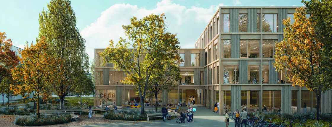 Dieser Gedanke spiegelt der Entwurf von SWAP wider: drei ineinander greifende „Vierkanthöfe“, deren Herz begrünt ist. Das Haus in Holzfunktionsbauweise ist offen und einladend, strahlt Wärme aus.
