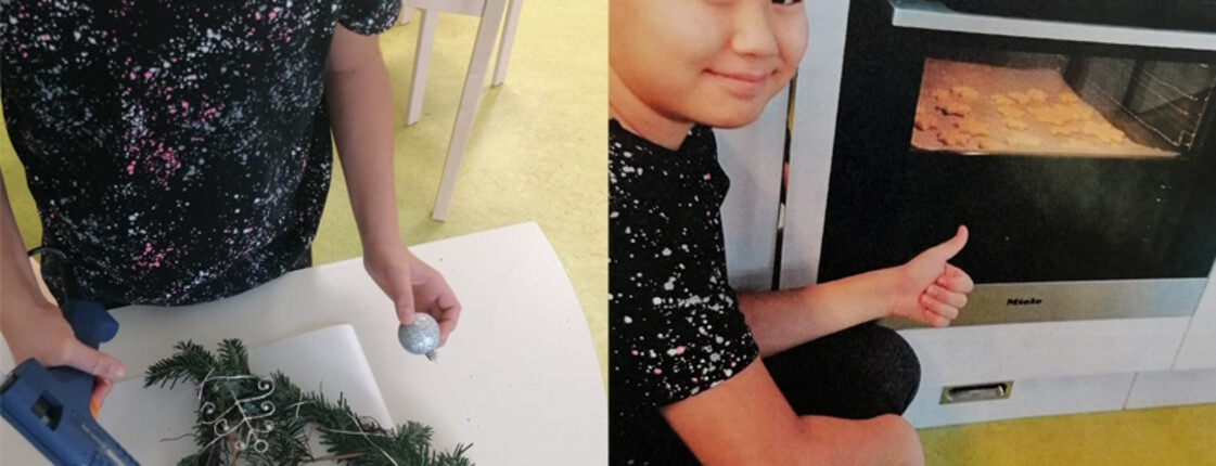 Um den Gruppenraum und Gang weihnachtlich zu gestalten, sammelte die Gruppe im Garten und Wald Naturmaterialien wie Äste, Reisig oder Steine und verzierte diese mit Kugeln, Sterne, usw. „Ich will Sterne kleben“, gebärdet Hiba aufgeregt. Entstanden sind dabei sehr schöne Türkränze, die die Kinder und Jugendlichen mit nach Hause nahmen.