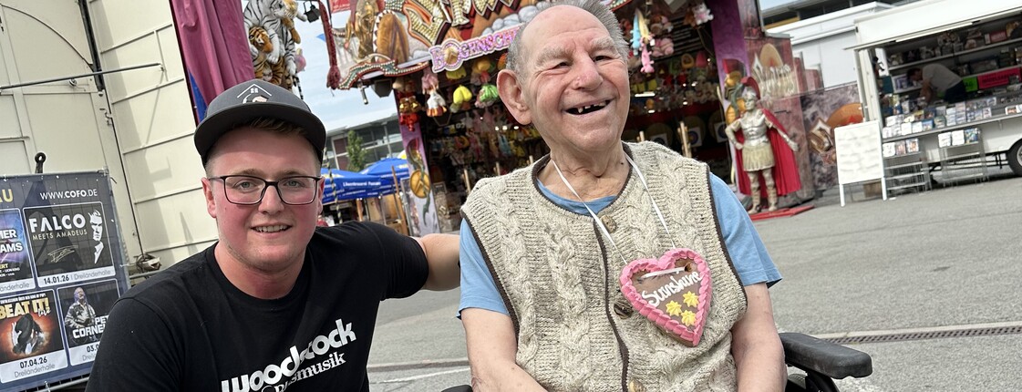 Beim Mittagessen kam die Rede auf die Passauer Dult. Da Max im Rollstuhl sitzt, braucht es für einen derartigen Ausflug eine*n Betreuer*in, der/die einen Bus fahren darf, in dem der Rollstuhl fachgerecht fixiert werden kann. Fahrer, Bus, Betreuung und Zivildiener waren vorhanden – also wurde kurzerhand für den nächsten Tag der Ausflug zum Volksfest angesetzt. Teamleiterin Natalie Ratzenböck begleitete gemeinsam mit Zivildiener Stefan Schredl drei Bewohner*innen der Wohngruppe 5 nach Passau. Gemeinsam genossen sie den Ausflug, bei dem sofort klar war, dass Stefan und Max, die eine sehr gute Bindung zueinander aufgebaut haben, in Tracht fahren werden. Und weil Max so ein sonniges Gemüt hat, bekam er ein Lebkuchenherz mit dem Schriftzug „Sunshine“.