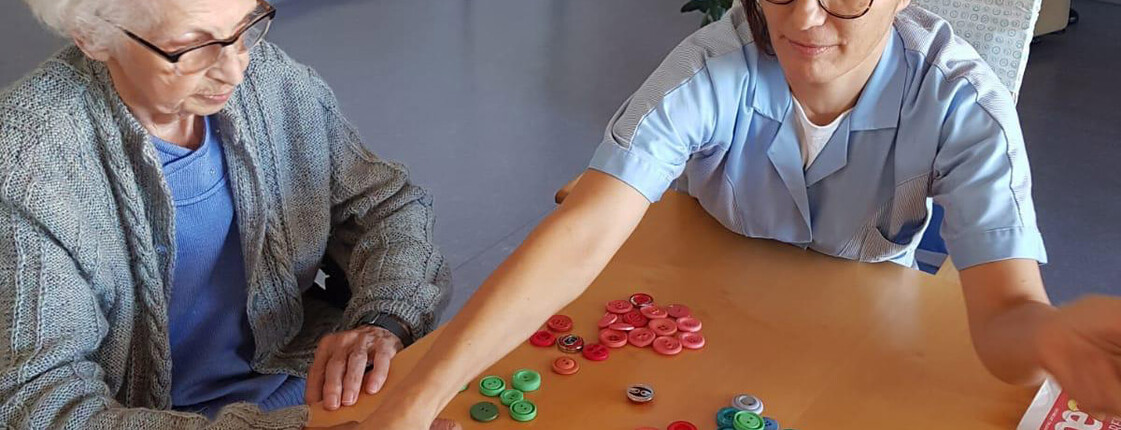 Für ihr Fachprojekt mit den Knöpfen hat sie sich deshalb entschieden, weil sie den BewohnerInnen eine Aktivierung bieten wollte, bei der sie selbst bestimmen konnten, was sie machen wollten. Gleichzeitig sollten ihre Fähigkeiten im Alltag gefördert werden. Ahdieh Vossough sammelte unzählige Knöpfe bei Nachbarinnen und Freunden – und so bot sie den BewohnerInnen des Seniorenzentrums die Möglichkeit, sich die verschiedenen Knöpfe anzuschauen und zu sortieren. Dabei kamen Erinnerungen hoch. Die BewohnerInnen begannen von ihren Spielen mit den Knöpfen als Kinder zu erzählen – und letztendlich gestalteten sie ein richtiges Kunstwerk als Wandbild aus den bunten Knöpfen.
