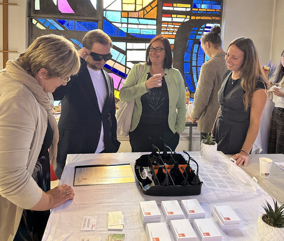 Dabei lädt die Ausstellung auch zum Ausprobieren und Einfühlen ein: beispielsweise werden mit einer speziellen Brille häufige Seheinschränkungen im Alter simuliert. Die Besucher*innen der Ausstellung können diese testen und verschiedene Aufgaben mit dieser Brille probieren, z.B. Zuckerl auszupacken. Selbst zu erfahren, wie schwierig diese normalerweise „einfache Aufgabe“ ist, trägt dazu bei, mehr Geduld aufzubringen, wenn andere Menschen mehr Zeit für „simple Tätigkeiten“ benötigen.