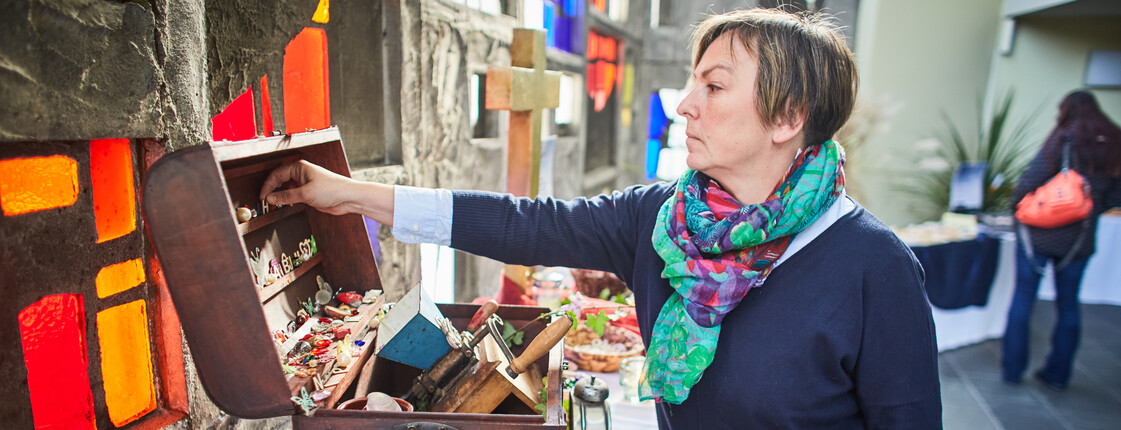Im TrauerRaum kann jede*r Besucher*in entlang von 12 gestalteten Stationen selbstständig und in Stille dem Trauer-Leben Ausdruck verleihen, zur Ruhe kommen, sich erinnern, persönliche Klagen und Bitten einer Klagemauer anvertrauen, eine Kerze anzünden, tröstende Gedanken und Texte mitnehmen.